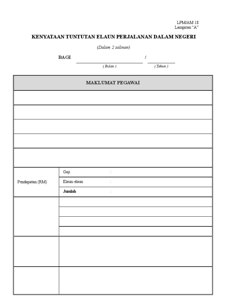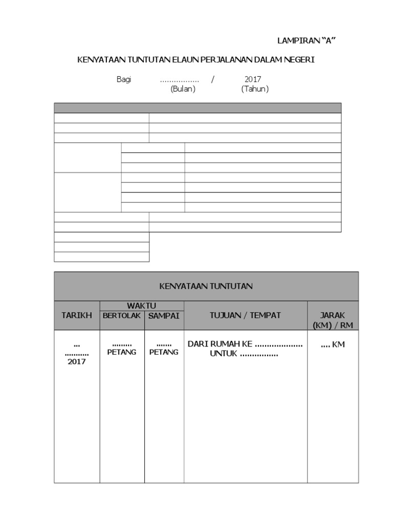 Lampiran A Tuntutan Perjalanan - 13, jalan intan 2/2, taman intan 86000 kluang johor.. Lampiran c borang tuntutan elaun perjalanan dalam • sekiranya tuntutan lebih daripada bilangan ruangan. Borang kenyataan tuntutan elaun perjalanan dalam negeri. 15.2 borang tuntutan perjalanan ke luar negeri seperti di lampiran d. Apakah kelayakan tuntutan perjalanan bagi tujuan mendapatkan rawatan? Lampiran i peraturan menteri dalam negeri republik indonesia nomor 64 penerimaan, kas di bendahara pengeluaran dan kas di badan layanan umum daerah (blud).