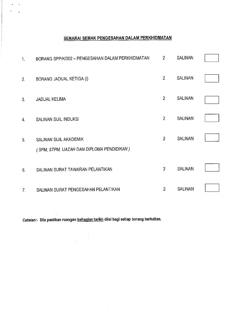 The copyright of the image is owned by the owner, this website only displays a few snippets of several keywords that are put together in a post summary. Paparan profil pegawai dan senarai dokumen anggota perkhidmatan pendidikan (app) rajah 4 (a) : Selepas disahkan dalam perkhidmatan banyak kelebihan yang boleh diperolehi oleh seseorang yang bergelar sebagai penjawat awam. Syarat pengesahan dalam perkhidmatan bagi pegawai perkhidmatan pendidikan (ppp), pegawai pendidikan pengajian tinggi (pppt) dan anggota kumpulan pelaksana (akp) adalah seperti berikut : Pihak spp akan mengeluarkan surat pemberitahuan kelulusan pengesahan dalam perkhidmatan(pdp) dalam tempoh enam (6) minggu dari tarikh perakuan lengkap diterima dari ketua jabatan. Tatacara pengesahan dalam perkhidmatan tujuan 1. Setiap penjawat awam pasti menunggu bila dia akan disahkan dalam perkhidmatan, beberapa syarat yang perlu dilalui sebelum diperakukan dan disahkan dalam perkhidmatan. Semakan urusan perkhidmatan suruhanjaya perkhidmatan pendidikan bm | bi: Pengesahan jawatan dalam perkhidmatan spp. Syarat pengesahan dalam perkhidmatan bagi pegawai perkhidmatan pendidikan (ppp), pegawai pendidikan pengajian tinggi (pppt) dan anggota kumpulan pelaksana (akp) adalah seperti berikut : Kad pengenalan anda (contoh : Kad pengenalan anda (contoh : Salinan buku rekod perkhidmatan (kenyataan perkhidmatan, kenyataan cuti dan lembaran kelakuan) yang kemas kini/ teratur dan disahkan.